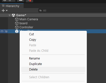 moveplate를 프리팹화 하기 위하여 생성했던 오브젝트를 다시 Object 폴더로 드래그합니다. 후에 MovePlate 오브젝트를 삭제합니다.