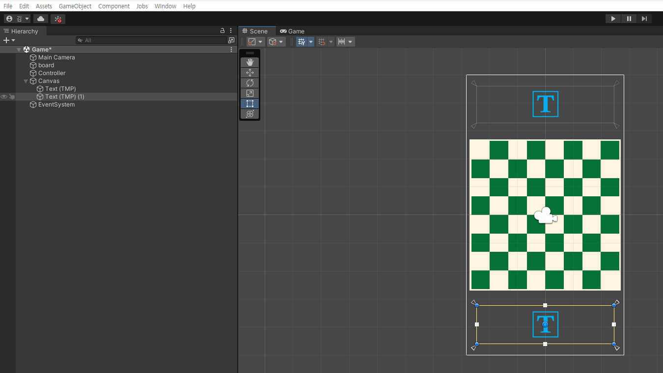 Text(TMP)를 복사, 붙여넣기 하여 Text를 하나 더 만듭니다. 복사한 오브젝트는 체스보드 하단으로 이동시킵니다.