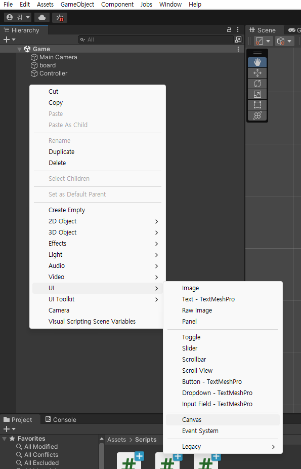 Hierachy 창에서 우클릭을 이용해 UI -> Canvas를 만들어줍니다.