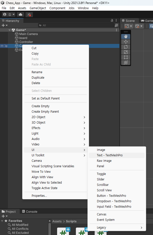 다음으로 UI Canvas 위에 게임오버(체크메이트) 텍스트를 생성하겠습니다. Hierachy창에서 Canvas 게임 오브젝트를 우클릭, UI -> Text - TextMeshPro를 클릭하여 Text 게임 오브젝트를 생성합니다. (영상에서는 예전 버전을 다루기 때문에 TextMeshPro가 아닌 Text를 사용합니다. 제 글에서는 최신 버전을 사용하는 기준으로 TextMeshPro로 제작하겠습니다만 영상과 같이 만들고 싶으시거나 TextMeshPro를 임포트 하기 귀찮으신 분들 께서는 Legacy의 Text를 사용하셔도 됩니다.