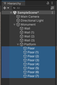 그리고 Floor 게임 오브젝트들을 Platform으로 드래그하여 하위 오브젝트로 옮깁니다. Ctrl을 누른 상태로 클릭하면 여러개의 게임 오브젝트를 동시에 선택할 수 있습니다.