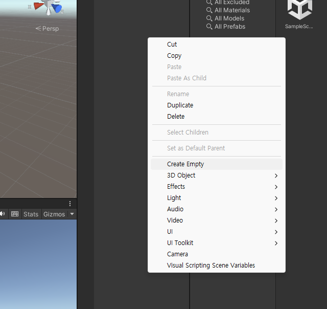 우선 빈 게임 오브젝트 부터 만들어볼까요? 지난번에 큐브를 만들었던 방식과 비슷하게 빈 게임 오브젝트를 만들겠습니다. (지난번에 만들던 큐브가 있다면 하이어라키창에서 클릭 후 Delete 혹은 우클릭 -> Delete로 제거합시다.)