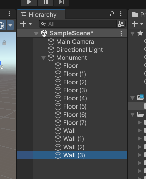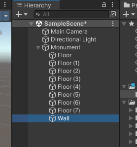 Monument 게임 오브젝트의 자식으로 다른 큐브 게임 오브젝트를 생성하고 이름을 Wall로 변경합니다. 설명은 생략하겠습니다.