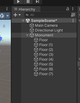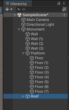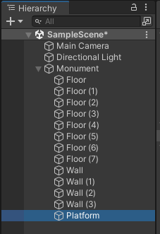 이제 천장을 만들겠습니다. Monument 밑에 Platform의 이름을 가진 빈 게임 오브젝트를 생성합니다.