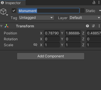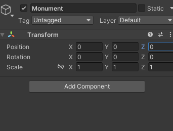 GameObject라 적혀있는 박스는 게임 오브젝트에 이름을 나타내는 것 같습니다. 이름을 Monument로 변경합니다. 이는 하이어라키창에서 F2를 누르거나 우클릭 -> Rename으로도 가능합니다.