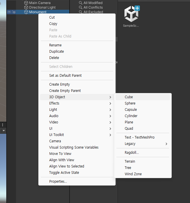 Monument를 우클릭하고 3D Object -> Cube로 Monumnet 하단에 Cube를 생성해줍니다.