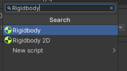 Add Component를 클릭하면 원하는 컴포넌트를 검색하여 추가할 수 있습니다. RigidBody를 검색하여 추가합시다.