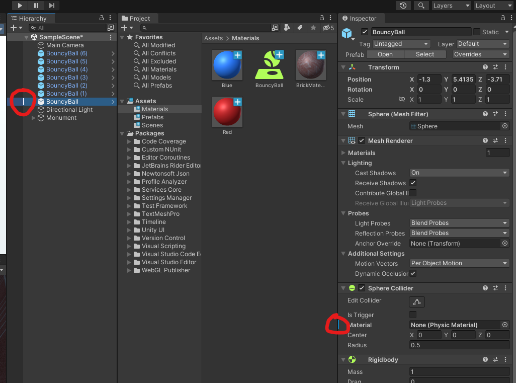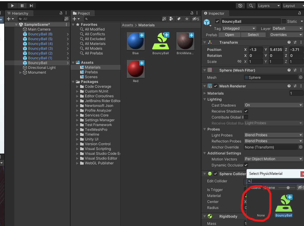 우선 아까 말했듯이 공 하나의 물리 머터리얼만을 변경해봅시다. BouncyBall 중 하나를 골라 Collider의 머터리얼을 제거해봅시다.