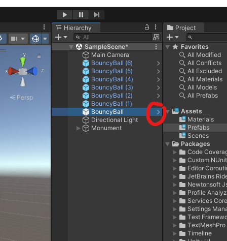 프리팹을 하나 수정해봅시다. 하이어라키 창에서 공 하나를 선택한 뒤 Alt를 누른 상태에서 우측의 화살표를 눌러봅시다.
