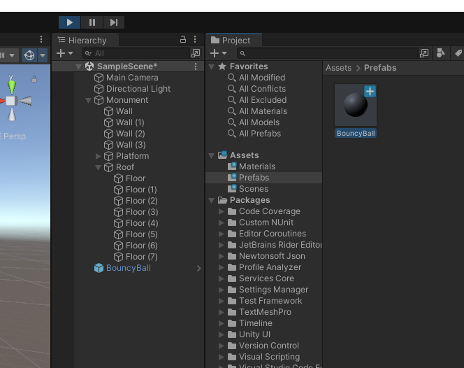 어? 하이어라키 창의 BouncyBall 게임 오브젝트의 이름 색이 파래졌습니다. 이 것은 저희가 만든 BouncyBall이 프리팹이 됐다는 뜻 입니다.