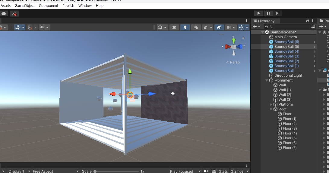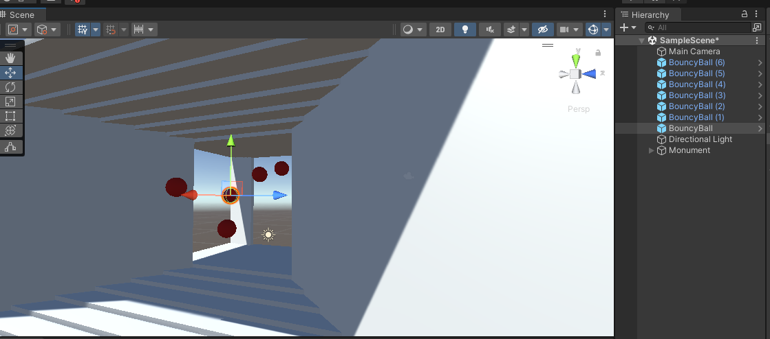 그럼 저희 이제 프리팹을 생성했으니 아까 얘기했듯이 이 오브젝트를 찍어내듯이 잔뜩 생성해봅시다. 생성한 프리팹을 다시 씬으로 드래그 해서 BouncyBall을 한 6~7개 정도 생성해봅시다.