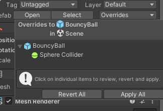 만일 변경사항이 마음에 안들면 Revert All을 눌러 원래 프리팹과 동일하게 바꿀 수 있고, 마음에 든다면 Apply All을 눌러 모든 프리팹에 변경 사항을 적용 할 수 있습니다. Apply All을 클릭해봅시다.
