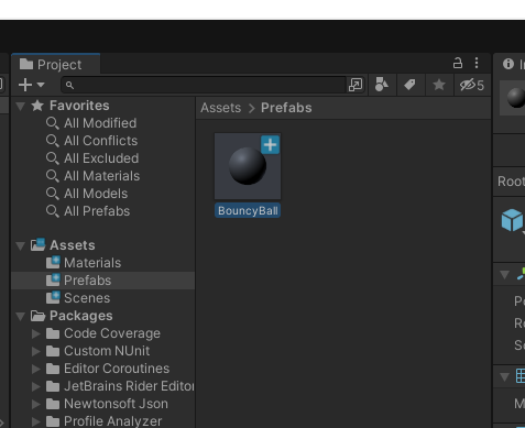 Prefabs 폴더에 변경한 BouncyBall을 드래그 합시다.