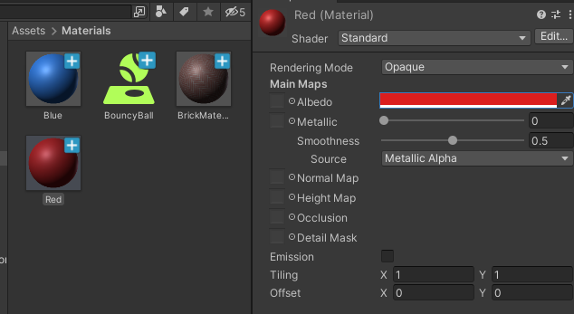 Materials 폴더에 가서 새 머터리얼 2개를 생성한 뒤, 하나는 빨간색, 하나는 파란색을 만들어봅시다. 방법을 까먹으셨다면 이전 글을 참고해주세요!