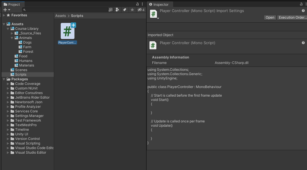 Assets 폴더에 Scripts 폴더를 생성하고 Scripts 폴더에 PlayerController 스크립트를 생성합니다.