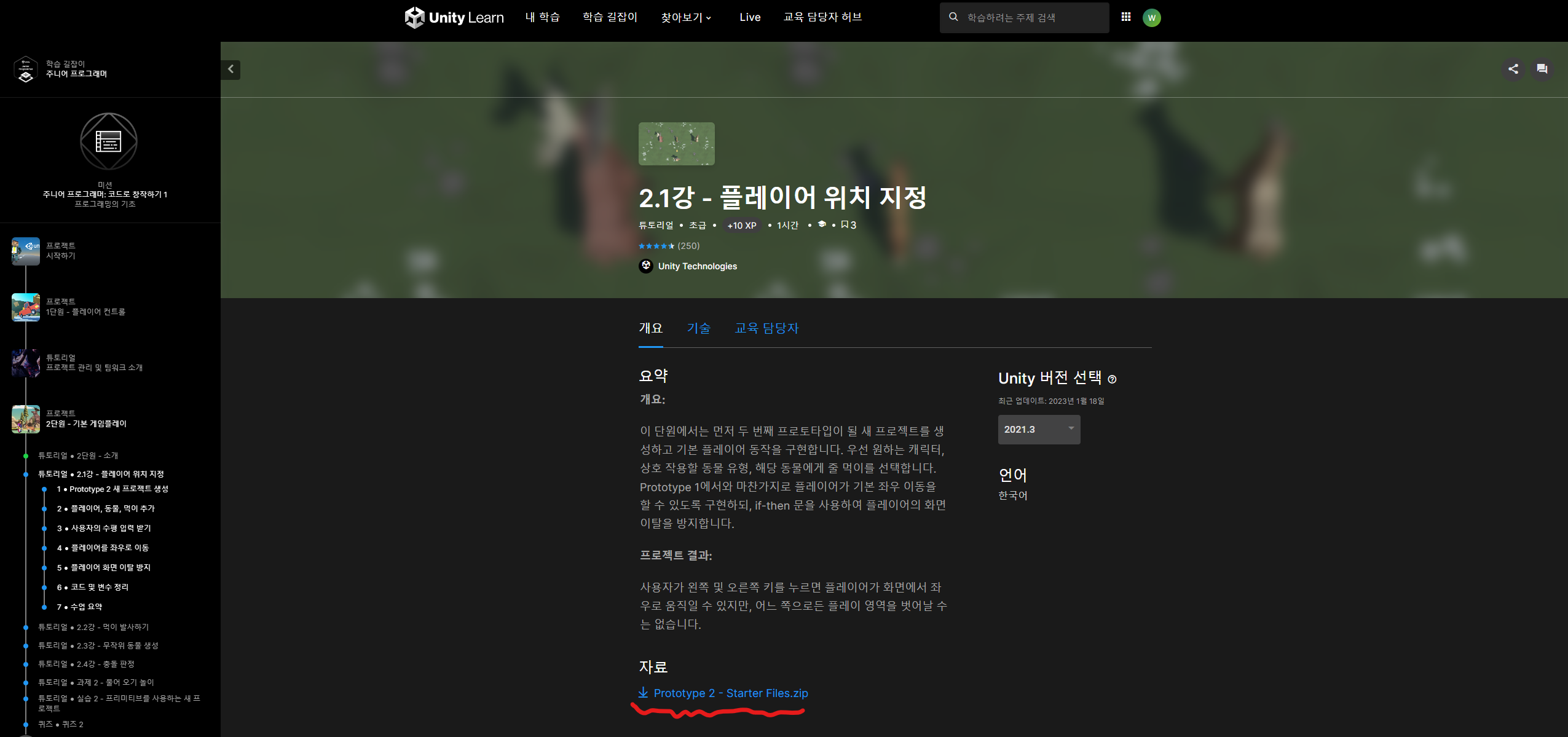 2.1강 - 플레이어 위치 지정 - Unity Learn