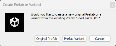 기존에 프리팹으로 만들어 두었던 에셋이기에 이런 창이 드네요. 파일을 바꿀 일은 없을 것 같으니 Original Prefab으로 생성합니다.