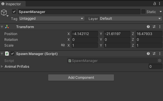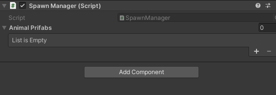 GameObject 배열 animalPrifabs를 선언하였습니다. 이렇게 되면 Unity Editor에서 어떻게 보일지 확인해봅시다.