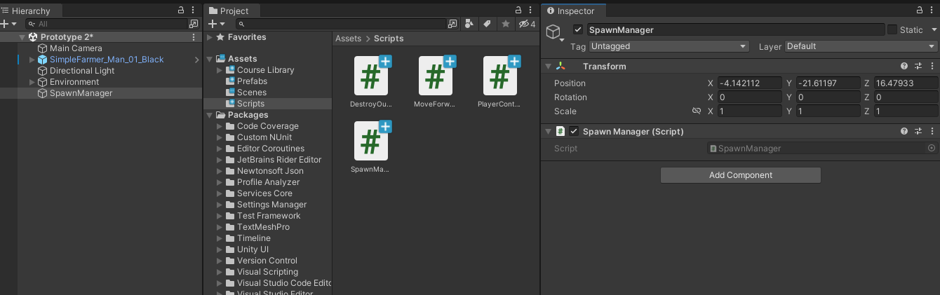 각 프리팹이 할당되었습니다. 이제 SpawnManager 스크립트에서 프리팹을 활용을 할 수 있게 되었습니다.