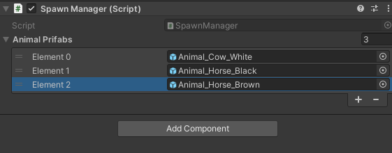 +를 눌러 배열에 추가할 수 있습니다. +를 하여 각 동물 프리팹들을 추가해줍니다.