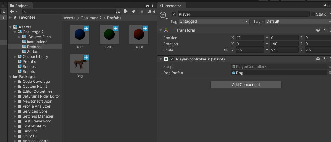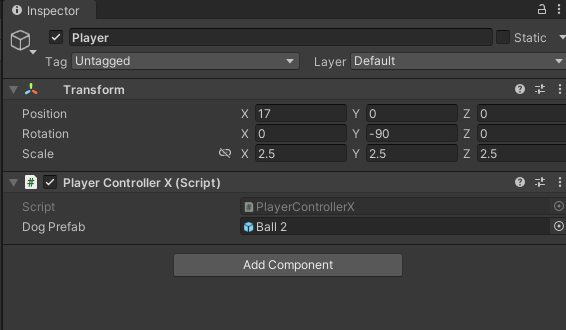 PlayerControllerX가 있습니다. 그리고 DogPrefab이라고 친절히 명명되어있는 프로퍼티에는 Ball2 프리팹이 할당되어있네요. 이것을 Dog 프리팹으로 바꿔줍니다.