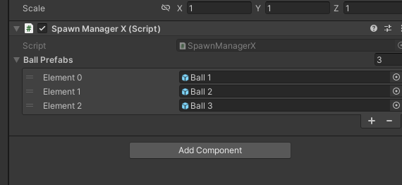 색깔별로 3개가 있네요. SpawnManager 컴포넌트의 배열을 저 공들로 채워줍시다.