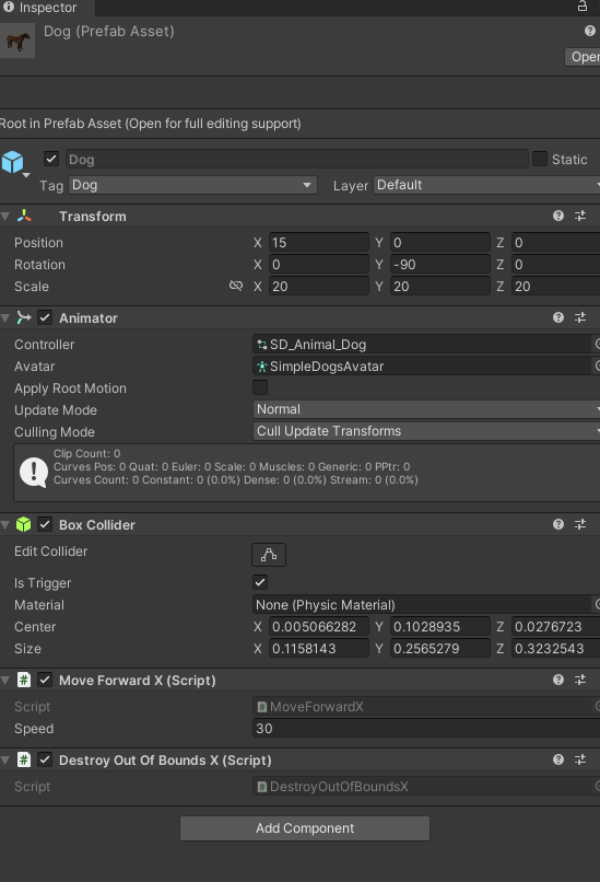 빨간색 x축이 우측... 그러니 왼쪽으로 갈 수록 Dog 게임 오브젝트의 position.x는 작아질 것 입니다.