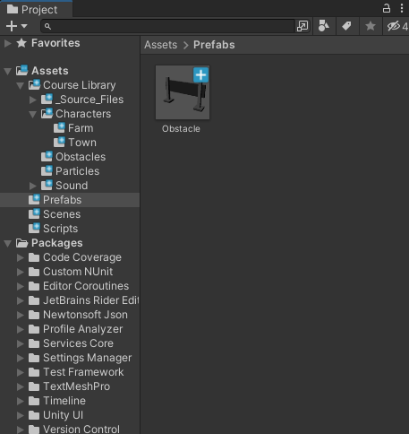 장애물을 여러개 만들기 위해 프리팹화 합니다. Assets에 Prefabs 폴더를 생성하고 Obstacle을 드래그해 프리팹화 합니다.