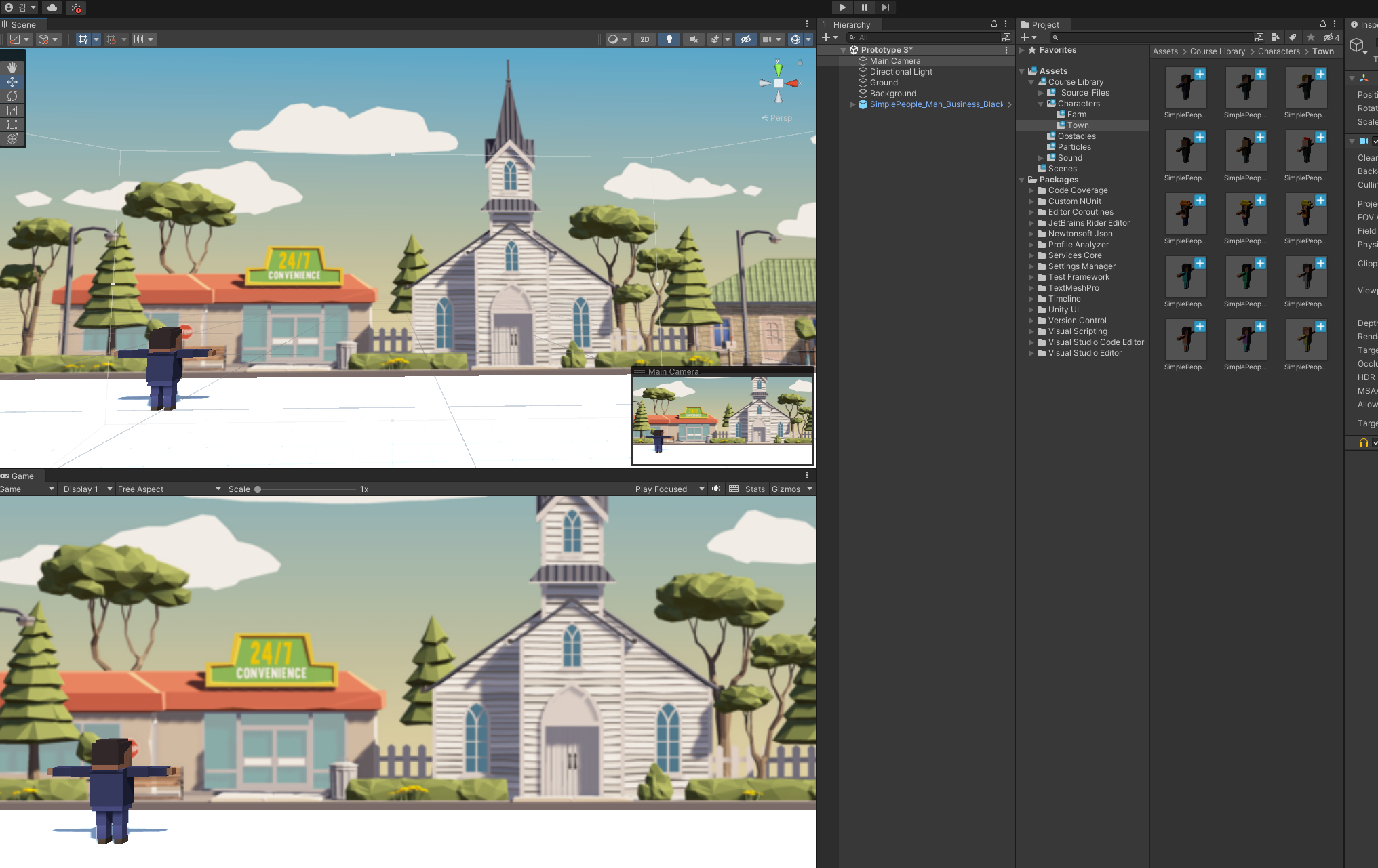 캐릭터를 하나 생성합시다. Course Library -> Characters에서 Farm, Town 중 원하는 폴더를 선택하고 캐릭터를 추가합니다. 하이어라키 창으로 드래그 하면 쉽게 생성됩니다.
