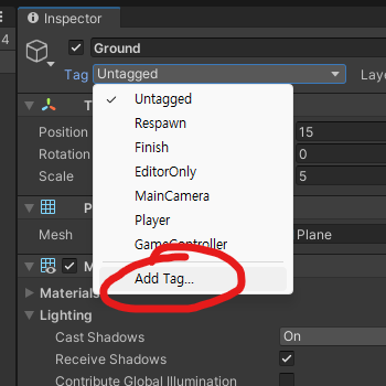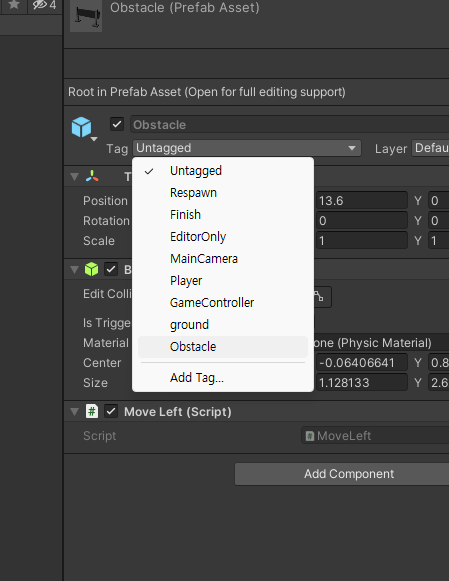 그러므로 장애물에도 Obstacle 태그를 생성하고 추가해줍니다.