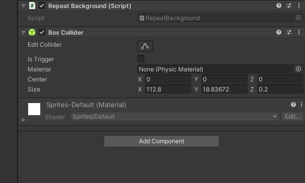 배경이 시작 위치에서 x축 기준 50만큼 움직여서 차이가 생기게 되면 시작위치로 돌려놓는 코드입니다. 하지만 아직 배경이 움직이지는 않네요. MoveLeft 컴포넌트를 Background에도 추가해줍시다.