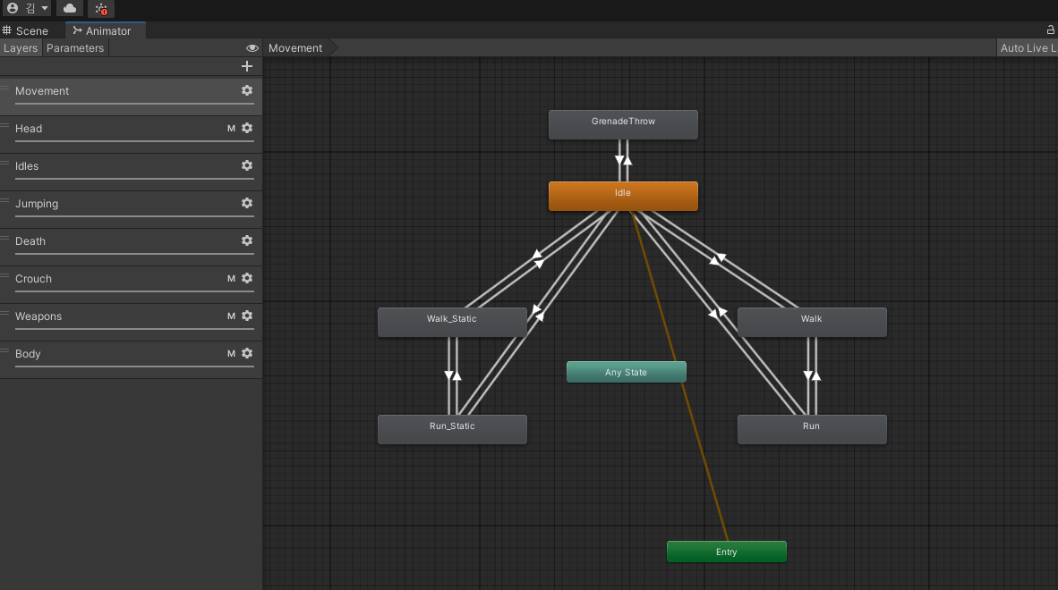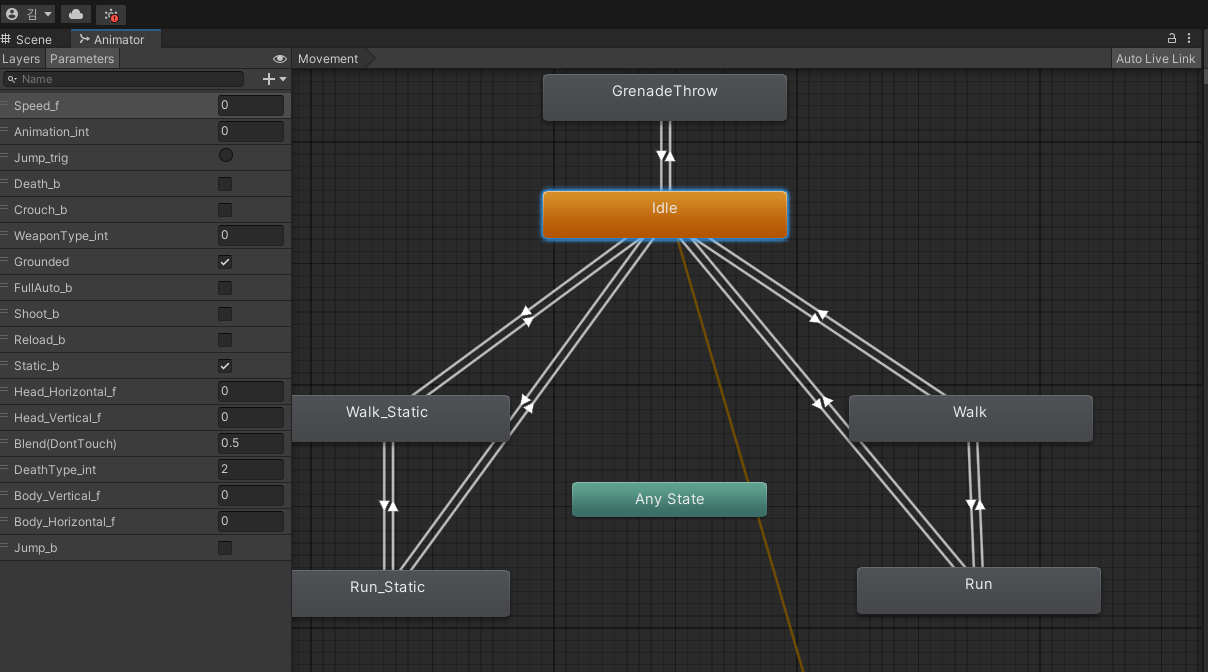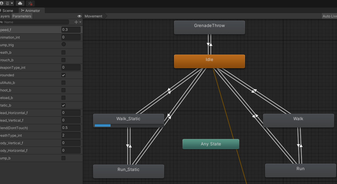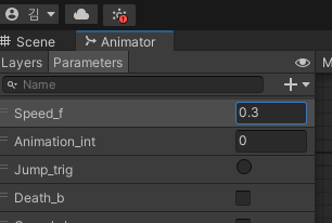 이 Parameters는 애니메이션들을 전환하기 위한 condition에 사용 되는 변수들입니다.