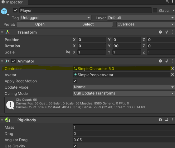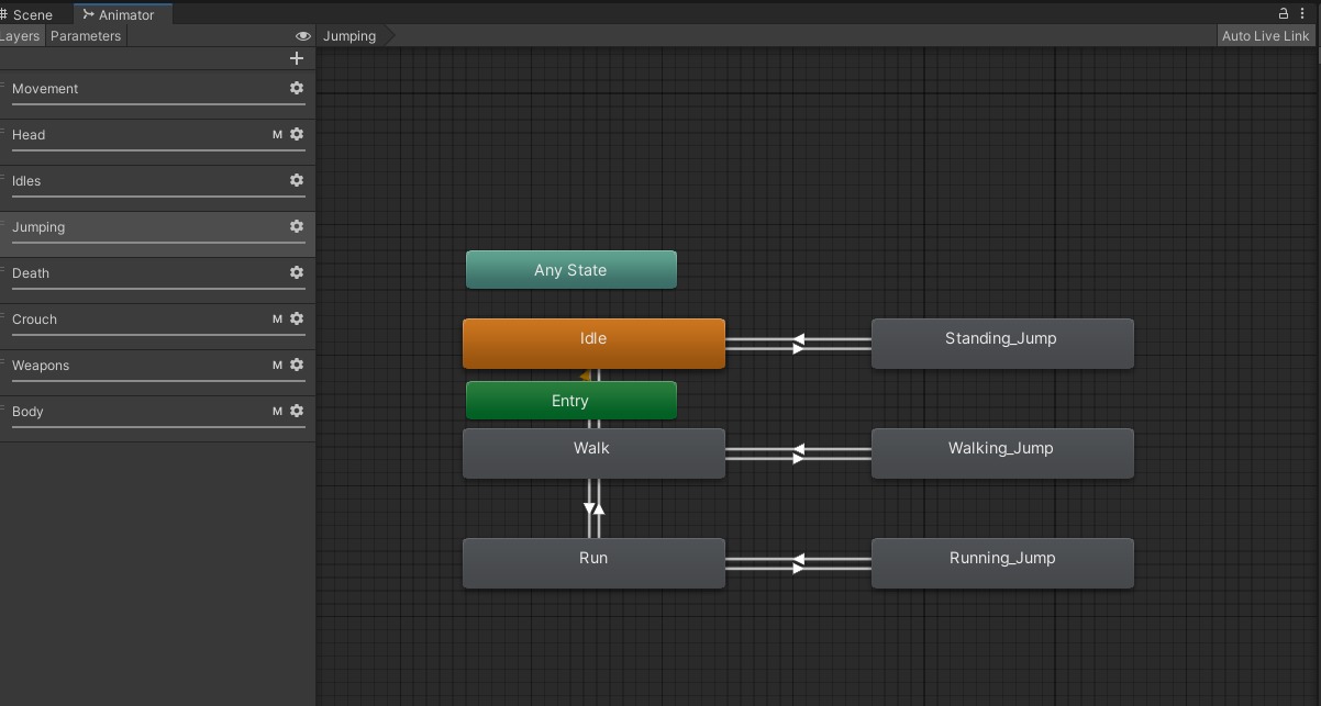 Animator 창의 좌측에 Jumping탭이 있는것을 보아 점프 애니메이션도 준비되어있는 것을 확인할 수 있습니다.