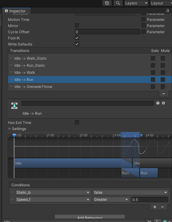 애니메이션은 자연스러움이 중요합니다. 그리고 어느 상태에서 어느 상태로 이동하느냐가 자연스러움을 만드는데에 큰 역할을 합니다. Transactions는 해당 애니메이션에서 어떤 애니메이션으로 이동할 수 있는지 경로를 나타냅니다. Animator창에서도 Walk는 Idle과 Run이 연결되어있는 것을 볼 수 있습니다.