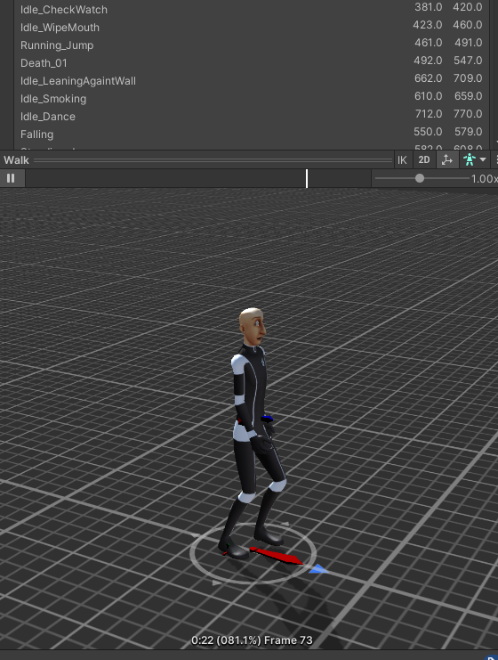 최하단의 Idle을 클릭하면 다음과 같이 애니메이션을 볼 수 있고, Clips에서 고른 다양한 애니메이션을 미리 볼 수 있습니다.