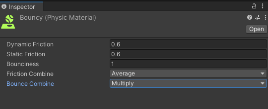 Bounciness 값을 1로 설정하고 Bounce Combine을 Multiply로 변경 한 다음, Player와 Enemy에게 적용하고 테스트합니다.