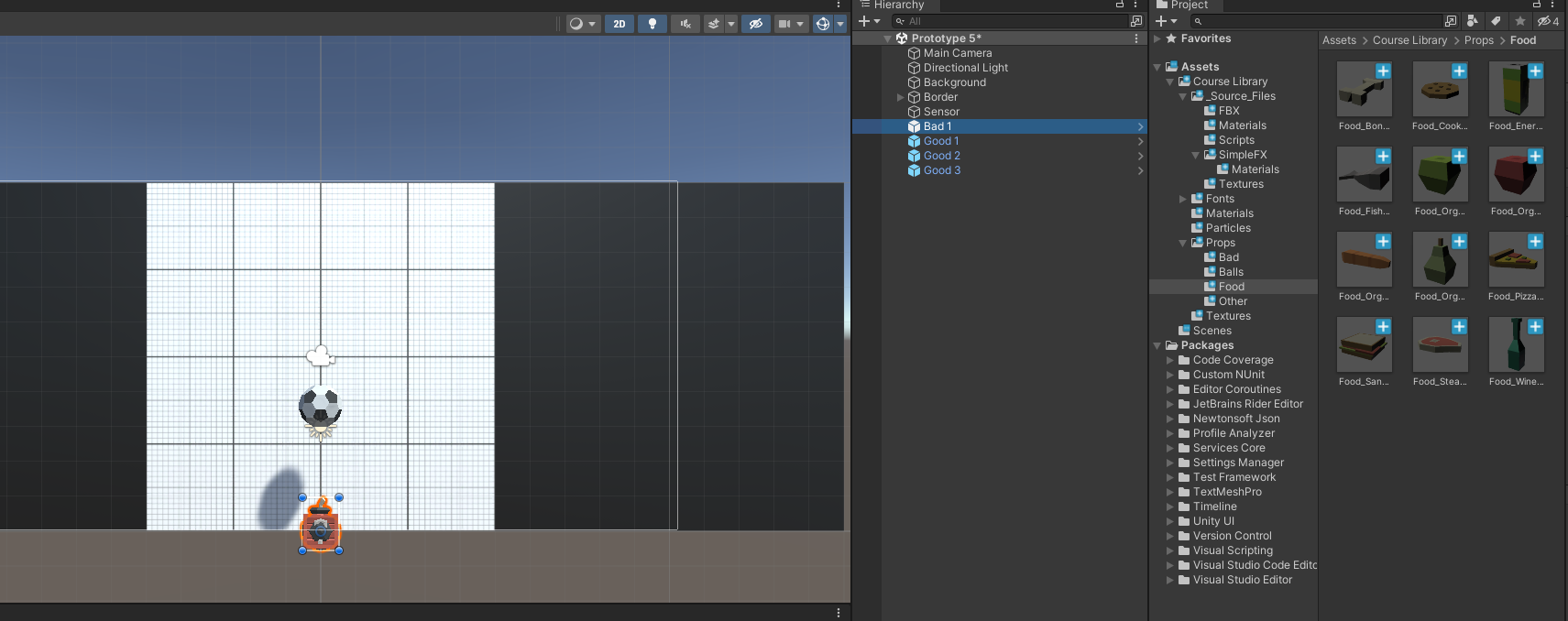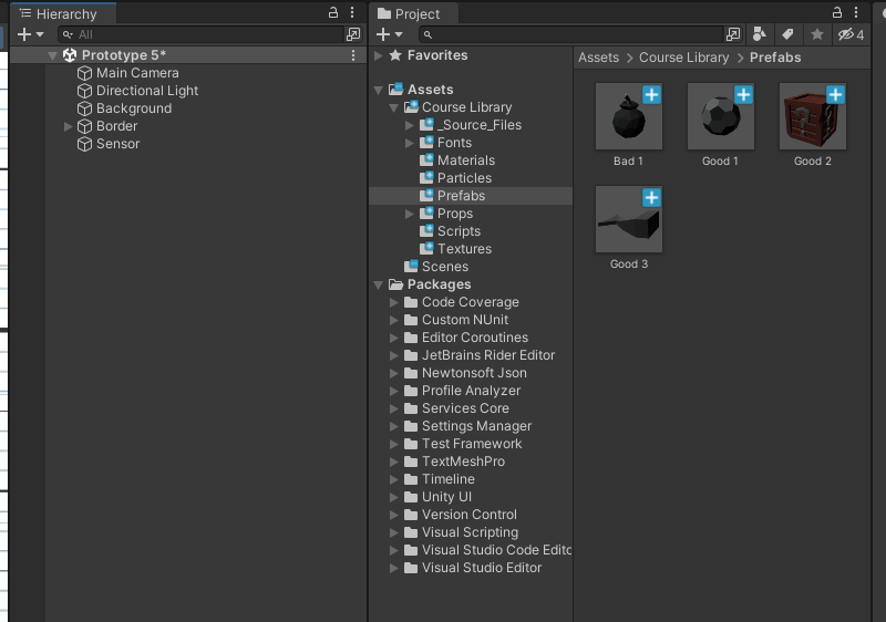 Library > props 폴더에서 착한 오브젝트 3개와 나쁜 오브젝트 1개를 씬으로 드래그하고, 이름을 Good 1, Good 2, Good 3, Bad 1으로 변경합니다.