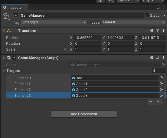그리고 Unity Editor로 돌아온 뒤 인스펙터창에서 GameManger 컴포넌트의 각 Target들을 Target 프리팹으로 채웁니다.