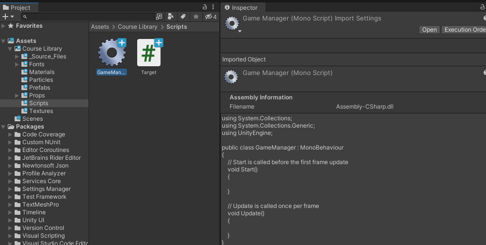 새 스크립트를 생성한 뒤 이름을 GameManager로 설정합니다. (재미있는 점은 이 경우 스크립트의 아이콘이 톱니바퀴로 바뀝니다.)