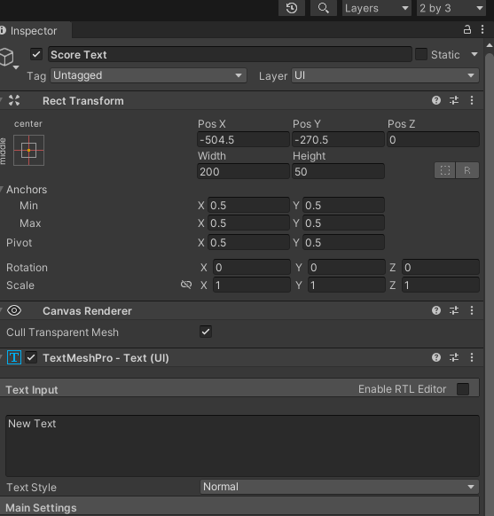 Text (TMP, Text Mesh Pro 의 약자입니다. )의 이름을 Score Text로 바꿉니다. 네. 점수판을 나타내기 위한 UI 입니다.