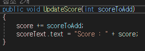 int 형태로 score를 선언하고 start 함수에서 0으로 변경, 출력으로 값을 변경합니다. TextMeshPro를 스크립트에서 사용하기 위해 using TMPro;를 사용하는 것을 잊지 맙시다.