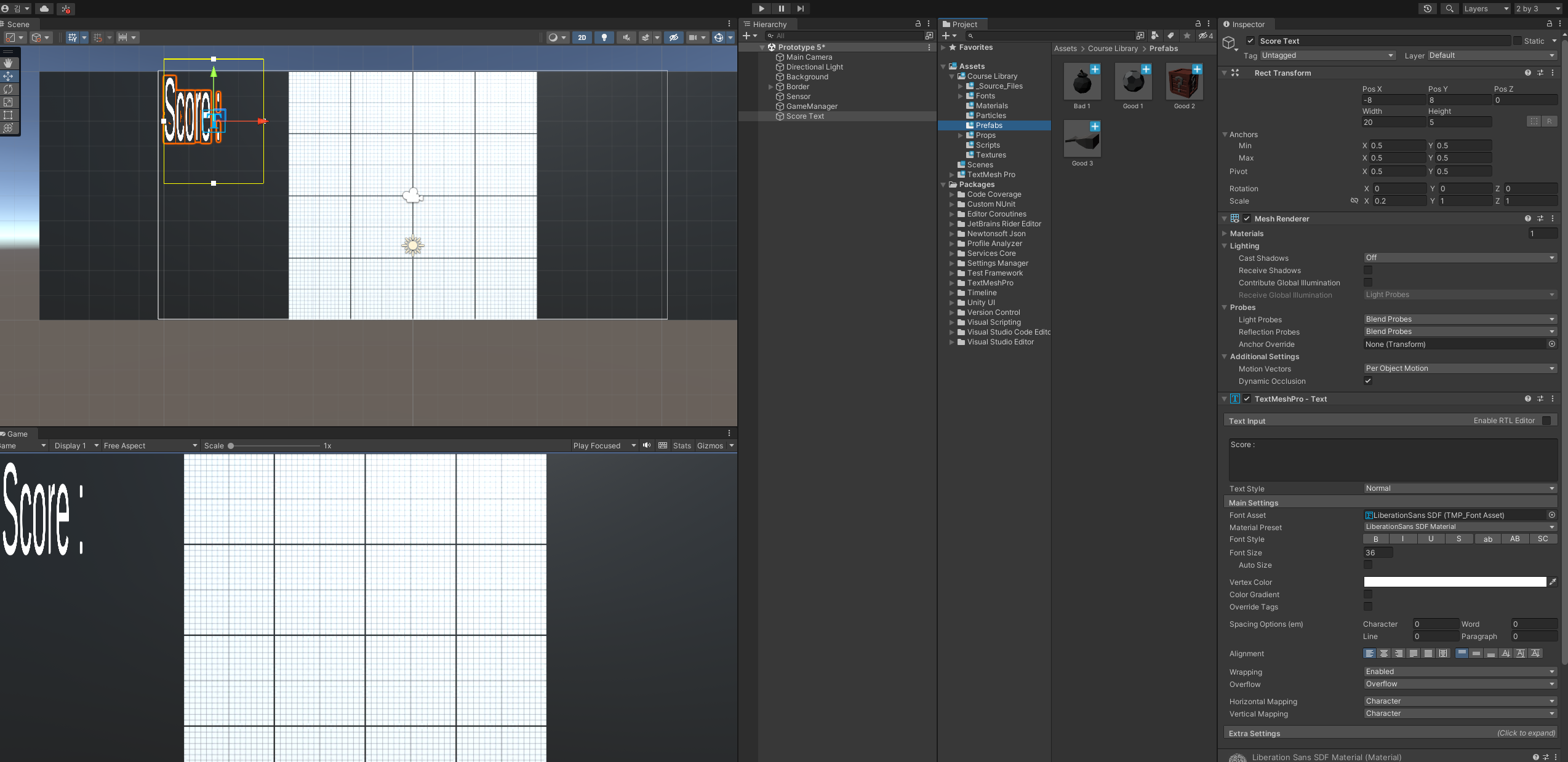 UnityEditor에서 GameManager 스크립트 컴포넌트에 Score Text를 부착하고 게임을 실행해봅니다.