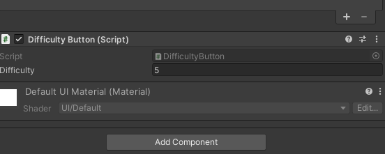 이제 각 난이도 버튼의 On Click에 할당되어있는 Restart()는 - 버튼을 눌러 제거하고, DifficultyButton 스크립트 컴포넌트를 각 버튼에 추가합니다.