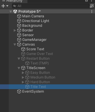 이제 Canvas에 빈 오브젝트를 추가 한 뒤, 이름을 Title Screen로 변경합니다. 안에 타이틀 텍스트와 3개의 버튼을 자식으로 옮깁니다.