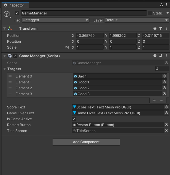 GameManager 스크립트에 TitleScreen 게임 오브젝트를 할당합니다.