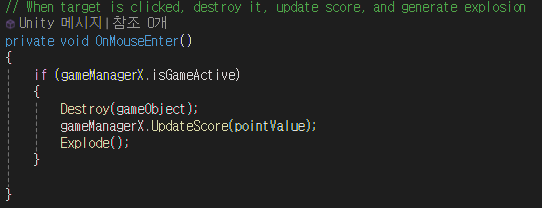 확실하네요. 이를 OnMouseDown으로 변경한 뒤 게임을 실행해보면 클릭해야 파괴가 되는 것을 확인 할 수 있습니다.