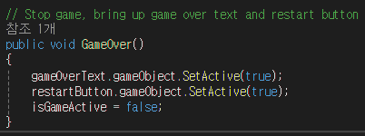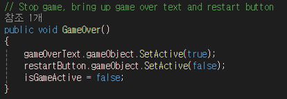 Restart 버튼이 생성되지 않는다고 합니다. GameManager에서 GameOver 함수를 찾아봅시다.