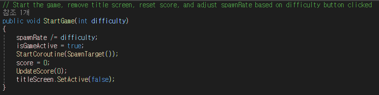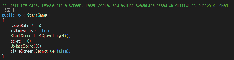 하지만 정작 GameManager의 StartGame은 인자를 받지 않고 spawnRate는 상수인 5로 나누어지는 것을 확인 할 수 있습니다.