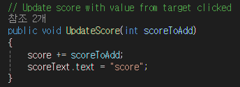 점수가 표기되지 않는 것 같습니다. 아무래도 Score 업데이트의 문제인 것 같네요. GameManager 스크립트를 확인 할 수 있겠습니다.